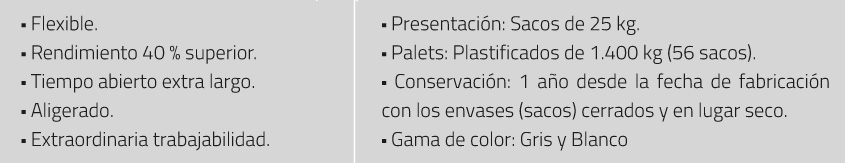 Adhesivo profesional, monocomponente, mejorado, aligerado, con deslizamiento reducido, tiempo abierto ampliado y deformable para aplicación en interiores y exterior.