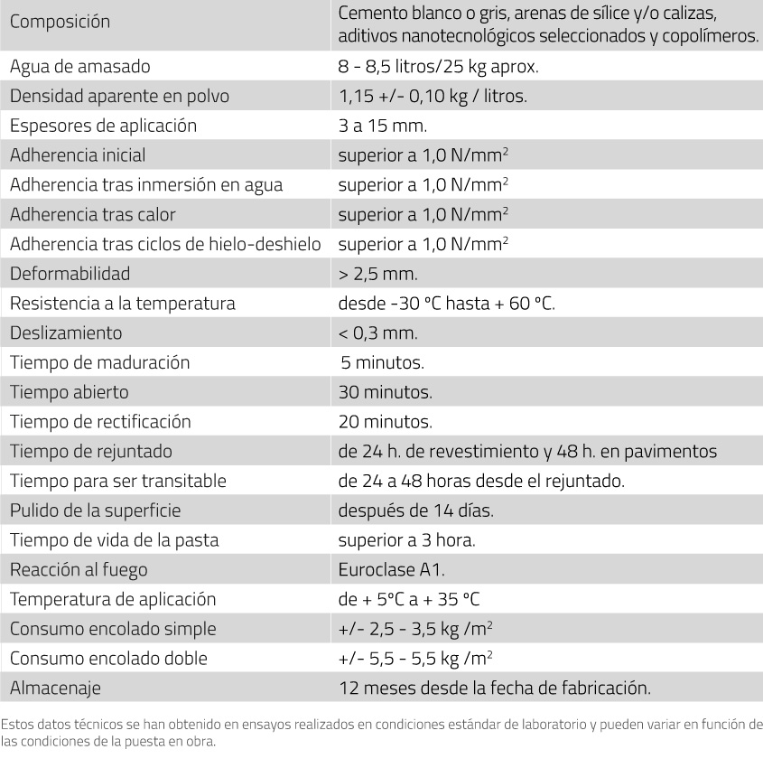Apto para la colocación de baldosas cerámicas: azulejo, baldosín catalán, barro cocido, gres cerámico, rústico y porcelánico, terrazo y piedra natural y artificial. Mosaico vidriado.